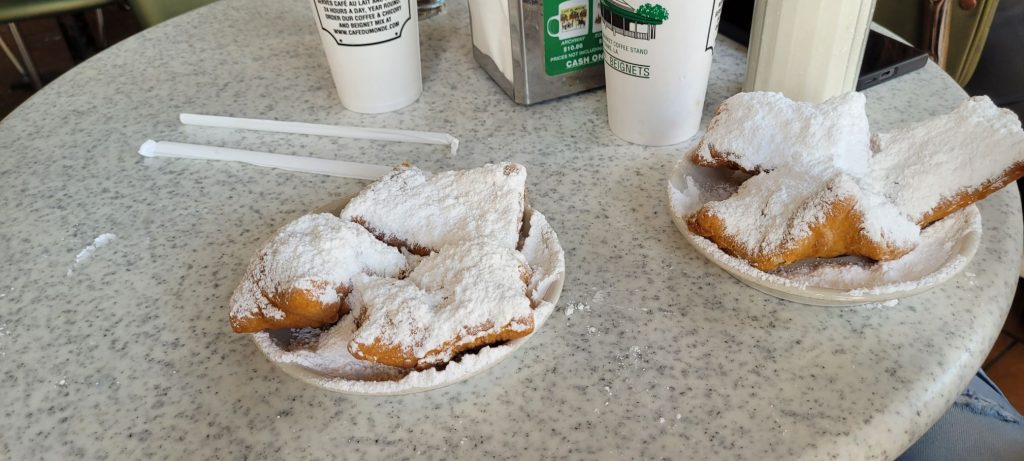 Obwohl mich dies nach dem oppulenten Frühstück wunderte, stellte sich auch ziemlich schnell das altbekannte Hüngerken ein. Unser erstes Ziel war also das berühmte Cafe Du Monde. Da New Orleans früher eine französische Kolonie war, spürt man den französischen Einfluss hier überall. Das Cafe Du Monde verkauft bereits seit 1860 frisch gebackene Beignets. Dies sind Teigtaschen aus Brandteig, ähnlich unseren Berlinern oder Krapfen. Wenn man aber schon denkt, dass bei uns viel Puderzucker zum Einsatz kommt, dann war man noch nicht in New Orleans. Der Boden war um die Tische quasi weiß und später sollten wir noch an Stellen in der Stadt vorbeikommen, wo man eindeutig sehen konnte: „hier wurde ein Beignet verspeist“.