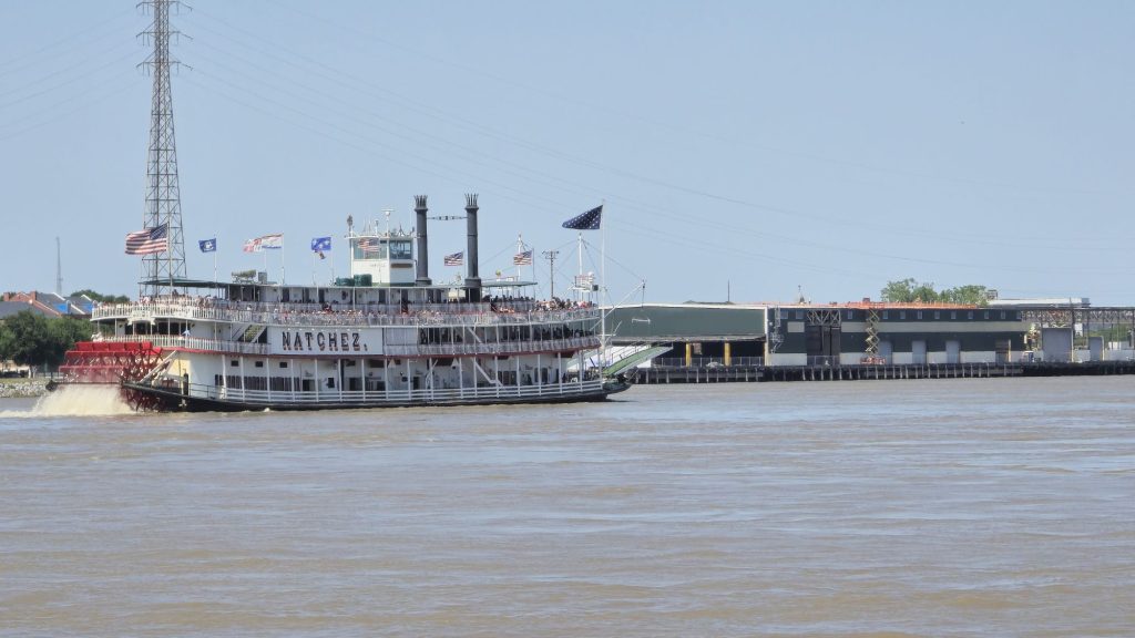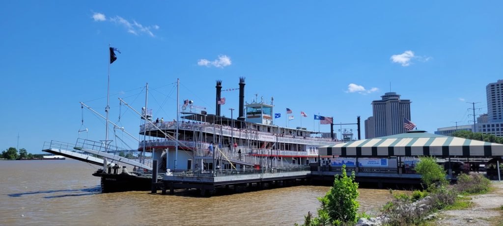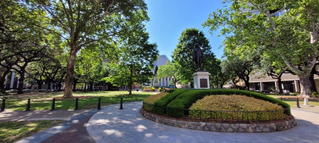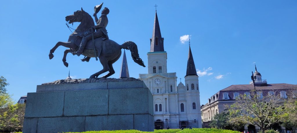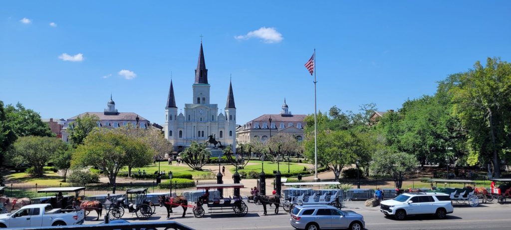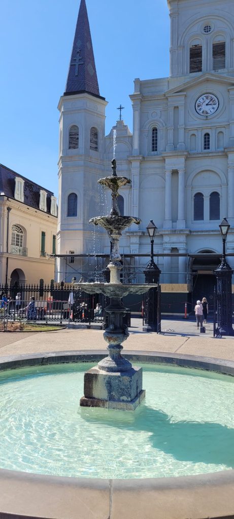 Nachdem wir diese Köstlichkeiten verspeist hatten, schlenderten wir ziellos durch das French Quarter und spazierten am Mississippi entlang. Dabei konnten wir sogar das einzige noch verbliebene aktive Dampfboot ablegen sehen (und hören). Auch den Jackson Square schauten wir uns an und lauschten den wilden Klängen einer Jazzband, die sich auch nicht von den Schildern stören ließ, dass dies wegen der benachbarten Kirche eine Ruhezone sei. Die zahlreichen Singvögel nutzten währenddessen den Springbrunnen im Jackson Square Park zum duschen und plantschen. Der Jackson Square ist deswegen geschichtsträchtig, weil hier formal die Herrschaft über Lousiana von den Spaniern auf die Franzosen übertragen wurde und später dann von den Franzosen auf die USA.