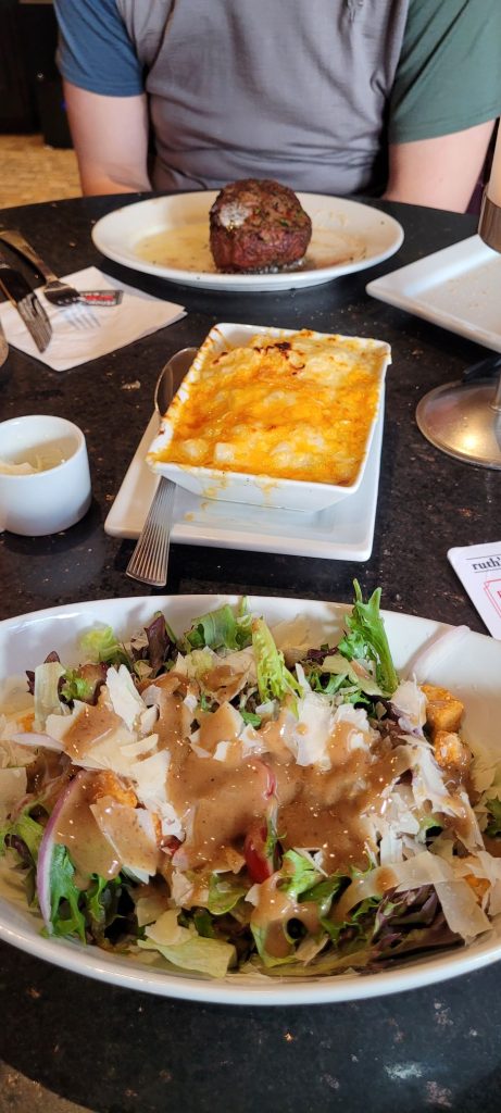 Da zumindest ein Hüngerken doch etwas hartnäckiger war, machten wir uns auf den Weg zu Ruth’s Chris Steak House, welches uns vom Taxifahrer zum Hotel empfohlen worden war. Weil wir ein wenig vor der offiziellen Öffnungszeit dort eintrafen, schlenderten wir noch weiter bis zum Lafayette Square an dem eine Statue von Benjamin Franklin, umgeben von schönen großen Bäumen und Blumenbeeten, zu sehen war.