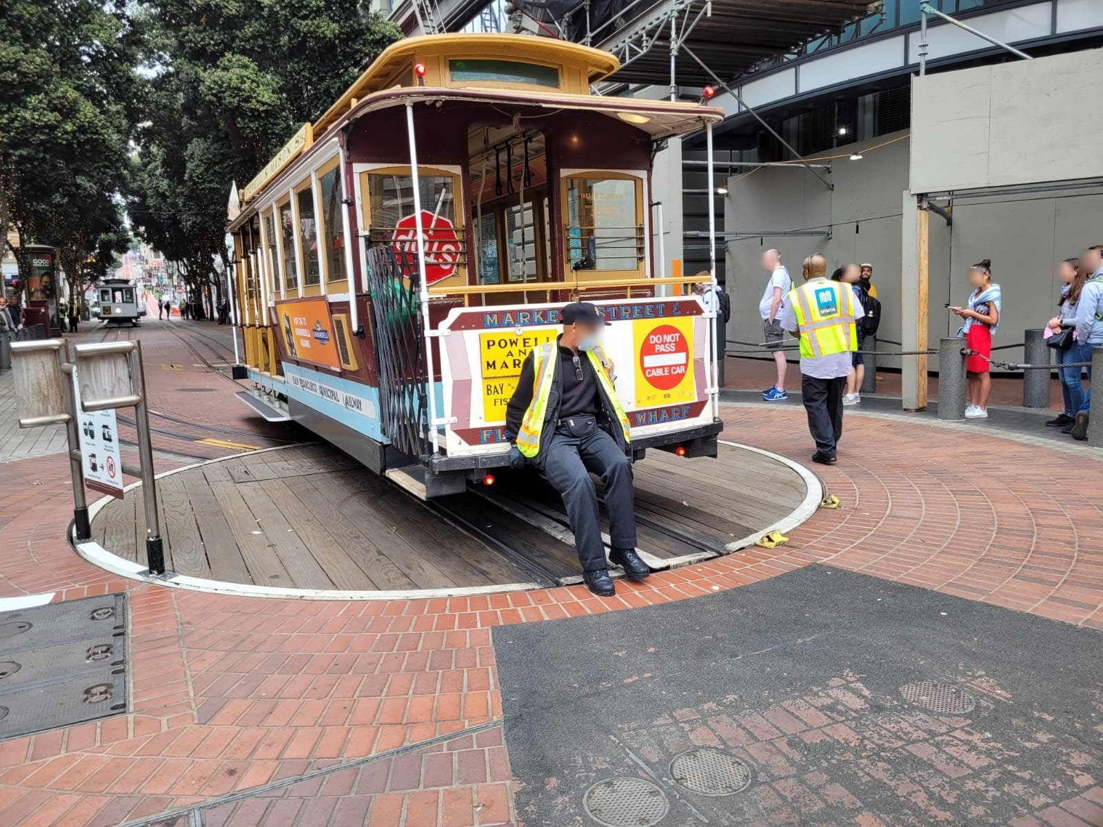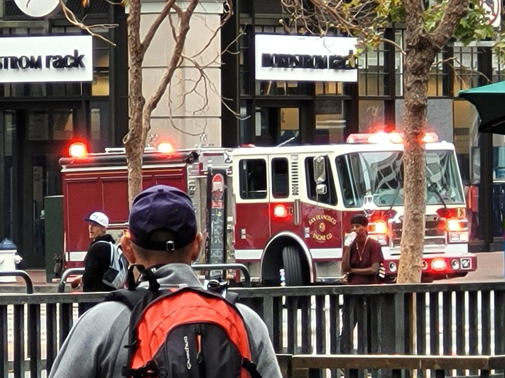 Als erstes machten wir anschließend eine Fahrt mit den berühmten „Cable Cars“. In der Warteschlange, die gefühlt „kartoffeliger“ als so manche Straßenbahn in Düsseldorf war, konnten wir beobachten, wie die Wagons per Muskelkraft auf einer Holzplattform gedreht wurden. Außerdem konnten wir noch einen ganzen Löschzug des San Francisco Fire Department auf Alarmfahrt sehen.
