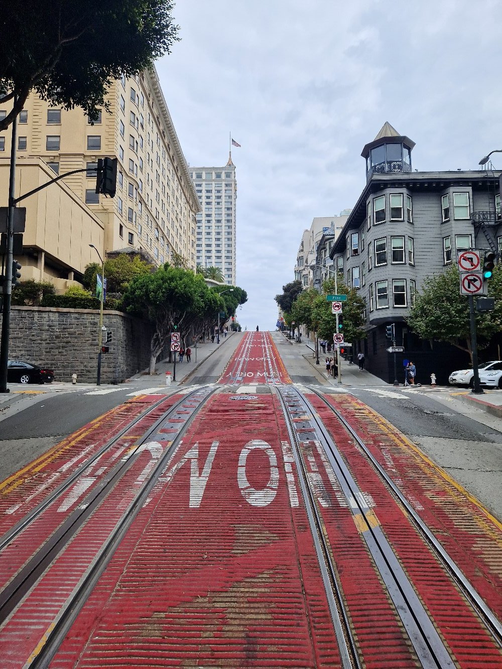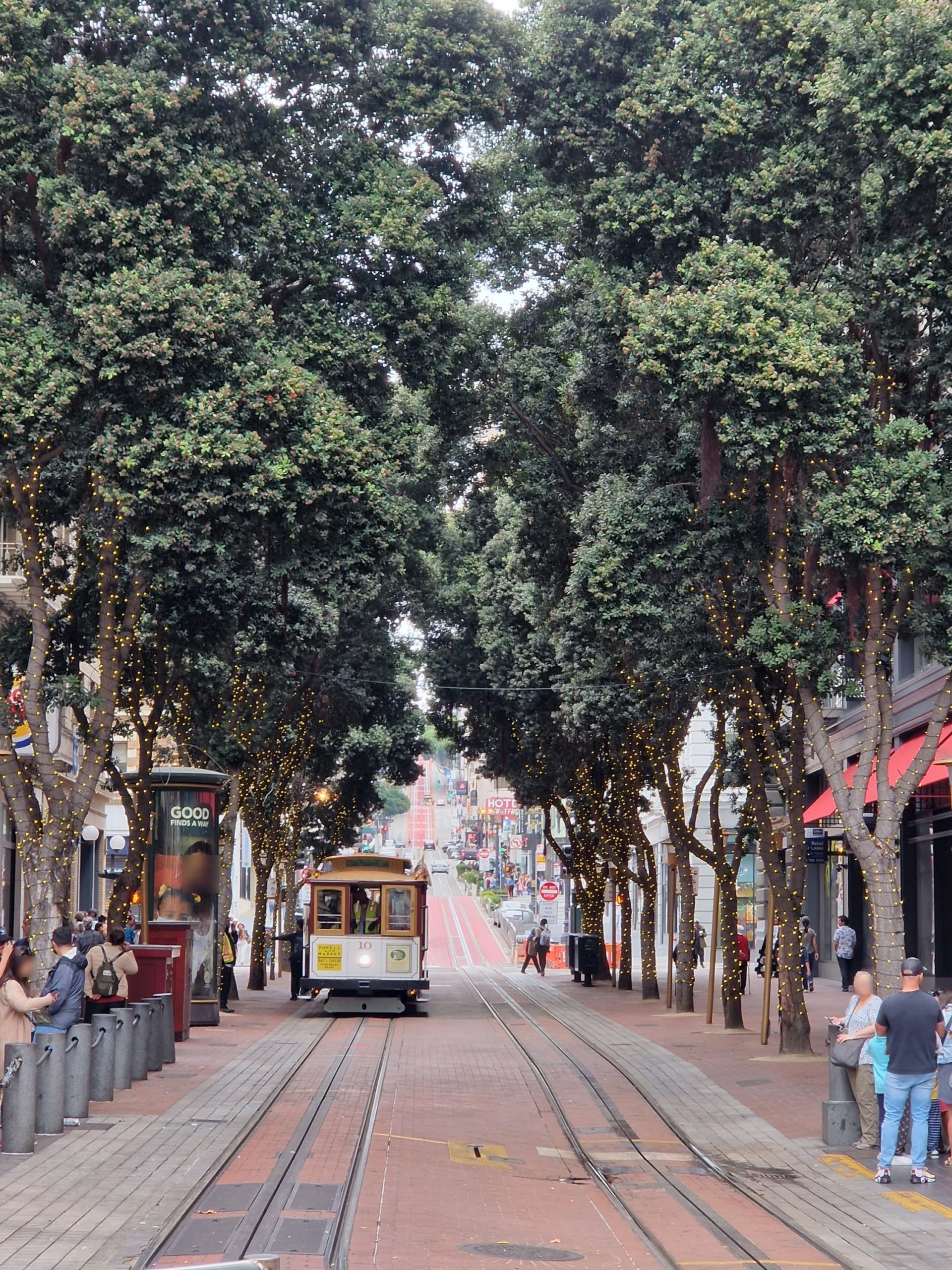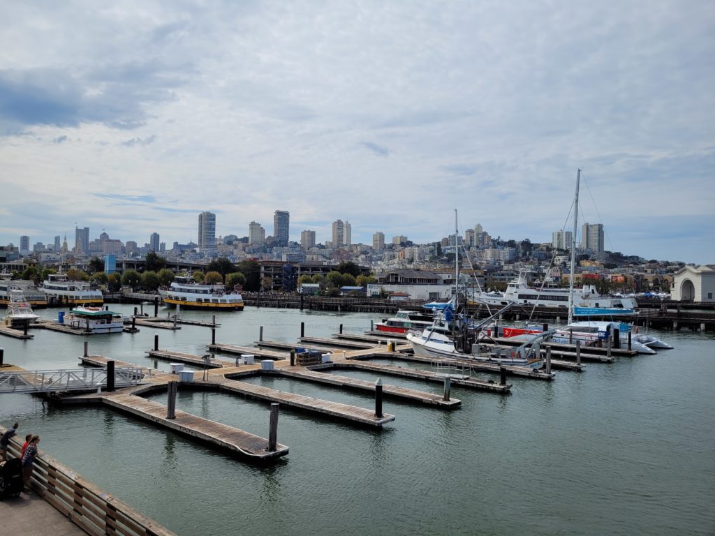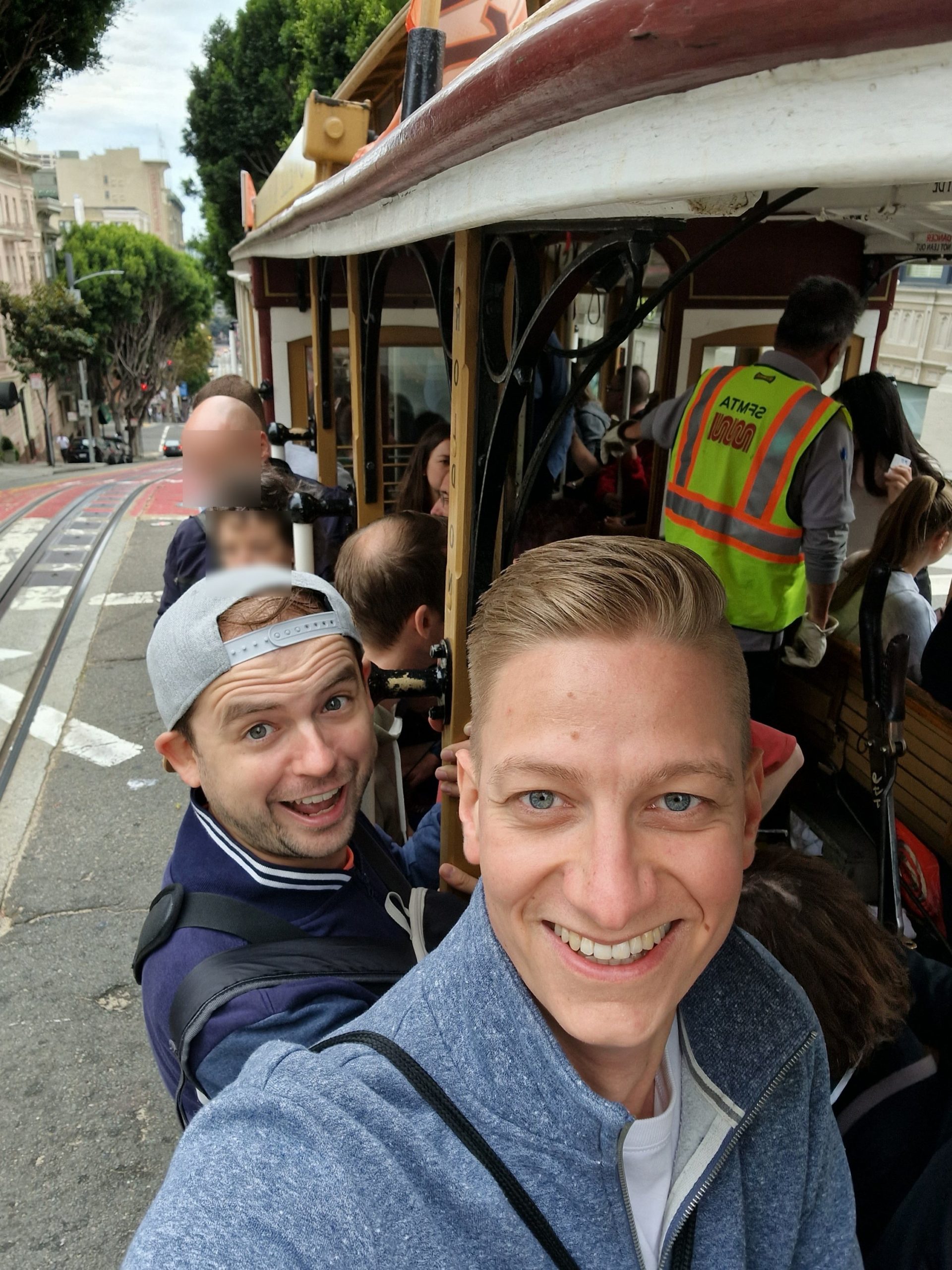 Auf dem Cable Car erwischten wir natürlich Stehplätze auf dem seitlichen Trittbrett. Der Hinweis vom Fahrer, dass man aufpassen sollte, weil es an den Seiten ganz schön eng werden könnte, machte das ganze nochmal spannender. Mit 15 km/h ging es die Hügel von San Francisco hoch und runter in Richtung Fisherman’s Wharf.