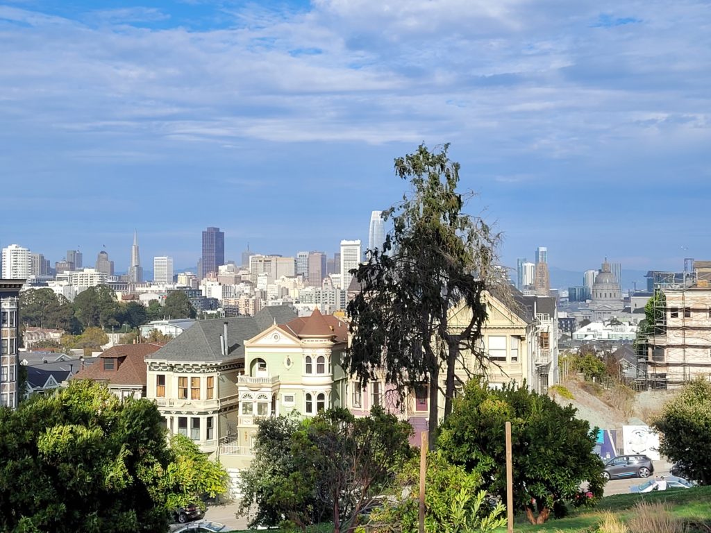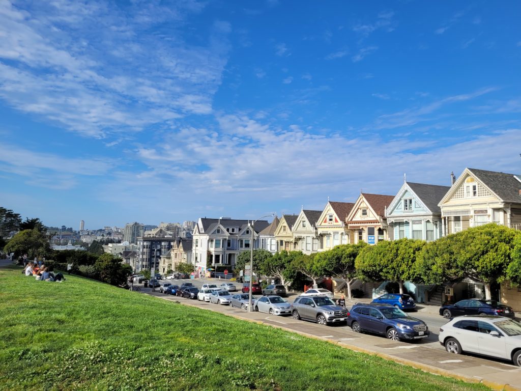 Während wir noch überlegten, ob wir einen Uber bestellen sollen fragten uns zwei Männer, ob sie unsere Powerbank nutzen dürften, da ihr Handy leer sei und sie genauso auf der Stadt abgewandten Seite gestrandet waren wie wir. Als Dank für unsere Hilfsbereitschaft nahmen sie uns dann kostenlos in ihrem Uber mit zurück in die Stadt. Beim Warten auf den Uber quatschten wir noch ein wenig und lernten so Ben und Jeff aus Utah kennen. Als wir endlich den doch kalten Winden entkamen und im Auto saßen, gab es noch einen großen Lacher für alle, denn obwohl wir inkl. des Fahrers nur mit fünf Leuten in dem Siebensitzer saßen und alle angeschnallt waren, alarmierte das Auto, dass eine Person nicht angeschnallt sei. Nach einiger Verwunderung mussten wir feststellen, dass der arme Max sich auf der hinteren Sitzbank so zusammenfalten musste, dass er auf zwei Sitzen saß und damit dem Auto einen weiteren Fahrgast signalisierte. Wieder in der Stadt angekommen, bestanden Ben und Jeff darauf die Fahrt auch wirklich allein zu zahlen und wünschten uns noch eine gute Reise. Als letzte Station vor dem Abendessen schauten wir uns noch die Painted Ladies an. Dies sind bunte kleine Holzhäuschen mit einer beeindruckenden Aussicht auf die Skyline von San Francisco.