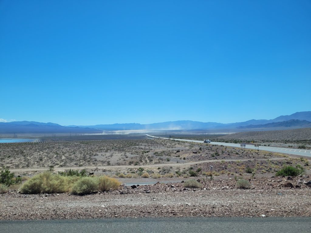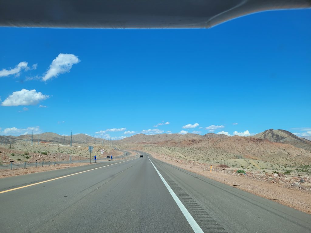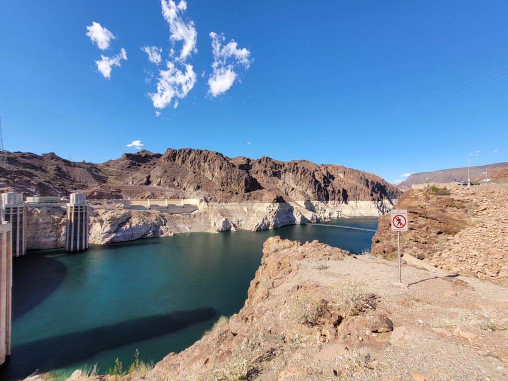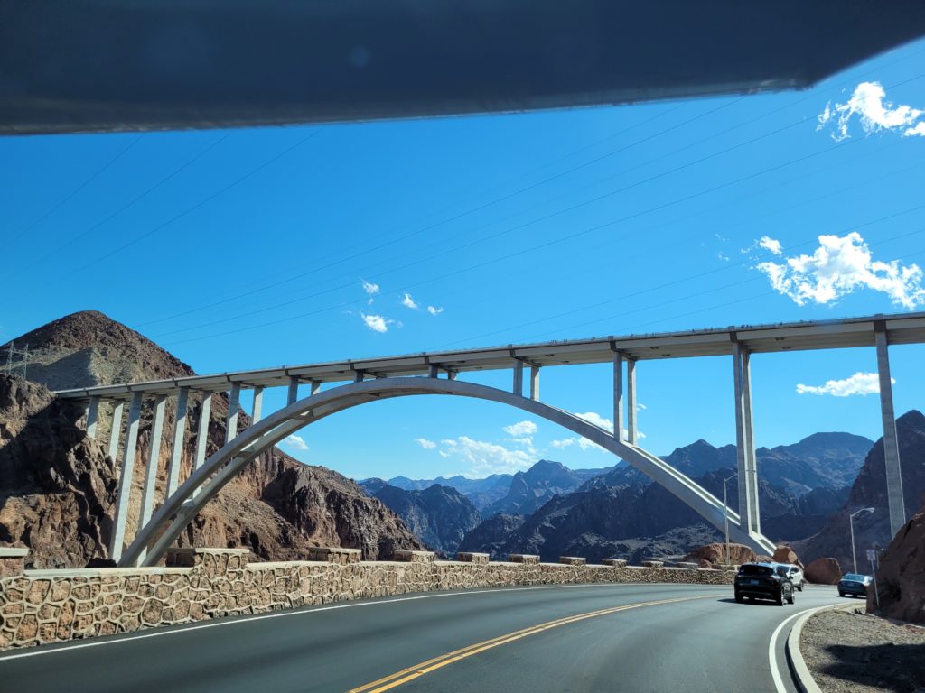 Er dient als Wasserzufuhr für Arizona, Nevada und Kalifornien und wird außerdem zur Stromgewinnung genutzt. Benannt ist der Staudamm nach dem ehemalige Präsidenten der USA Herbert Hoover. Mit ihren 221 m Höhe war die Staumauer des Hoover Dams bis ins Jahr 1961 die höchste Staumauer der Erde. Danach wurde sie von der Vajont-Staumauer in Italien abgelöst. Da wir uns hier mit unseren neuen Freunden Sina und Justin verabredet hatten, überbrückten wir die Wartezeit mit dem Mittagessen, welches wir im von Windboen durchgerüttelten Mogli zu uns nahmen. So konnten wir uns wenigstens die Klimaanlage sparen, denn der kühle Wind sorgte durch die geöffneten Fenster für eine ganz natürliche Abkühlung.