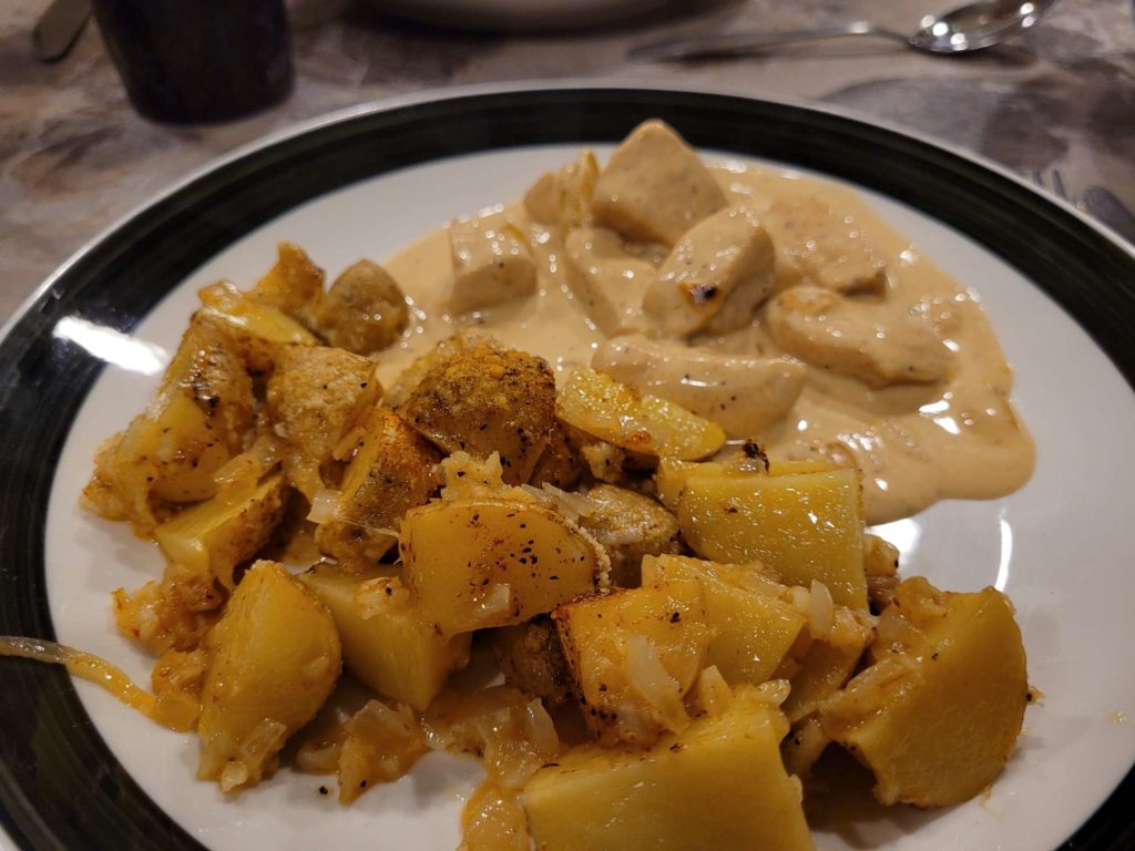 Als wir an der Campsite ankamen, die unser letzter Stopp für diese Reise sein sollten, checkten wir fix ein und suchten uns auf dem großen Areal mit Volleyball-, Minigolf- und Bolzplätzen ein schönes Plätzchen direkt am Fluss aus, schlossen Mogli an die Versorgung an und machten uns an die Essensvorbereitungen. Heute gab es Knoblauchkartoffeln in einer knusprigen Parmesankruste mit Hühnergeschnetzeltem.