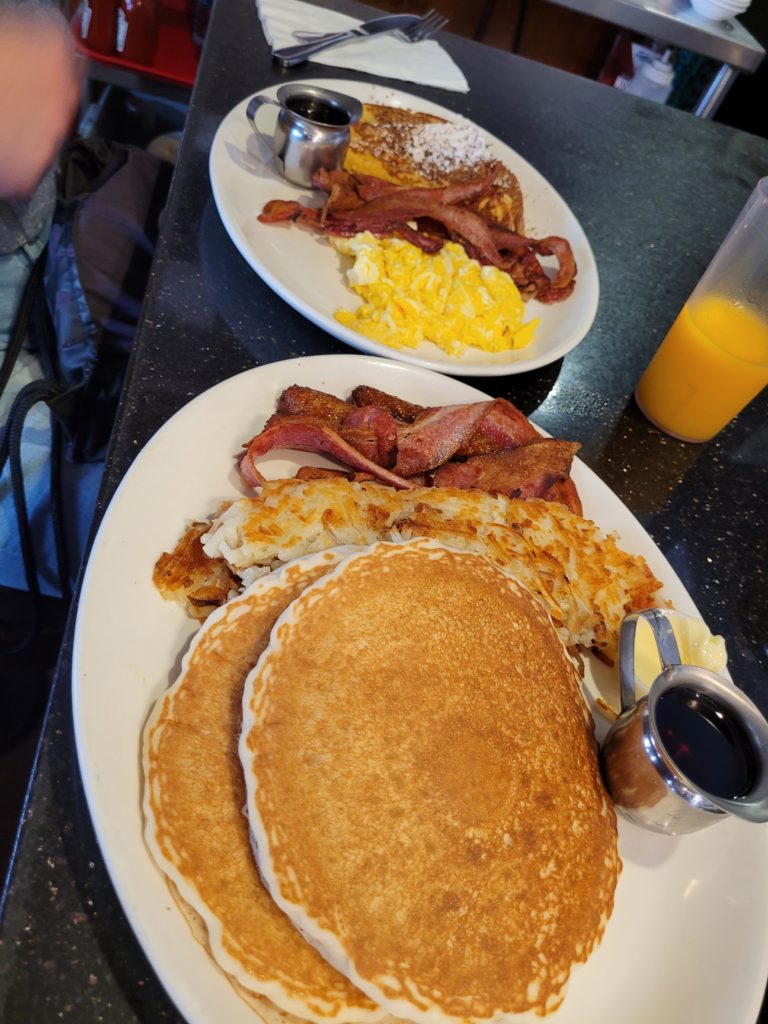 Für das Frühstück im Pinecrest Diner mussten wir heute erstmal Schlange stehen, denn obwohl es werktags ist, war das von uns erwählte Diner komplett besetzt. Während des Wartens konnten wir die traurige Diskrepanz zwischen den Leben der Menschen in den USA (und an so vielen anderen Orten der Welt) ziemlich eindrücklich beobachten. Während sich im Fenster rechts neben uns Menschen mit vor Fett triefenden Fingern Bacon, Pancakes und Ahornsirup in den Mund schaufelten, bettelten links von uns die Obdachlosen um ein wenig Geld für Nahrung (oder vielleicht auch den nächsten Schuss).