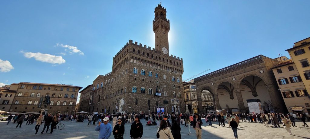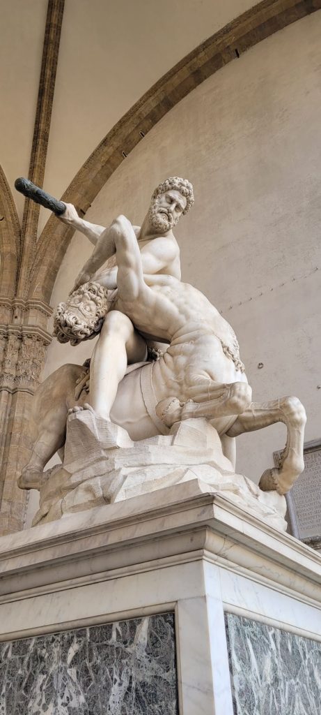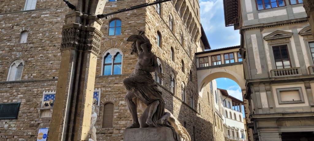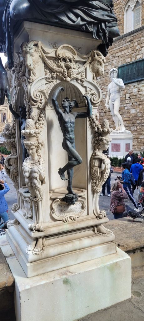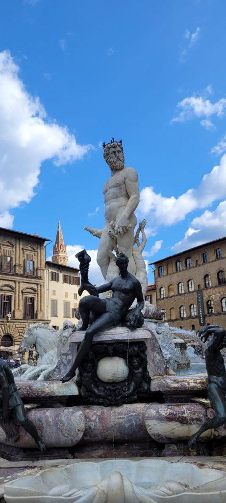 Um wenigstens etwas Kunst genießen zu können, schauten wir uns ausgiebig die Piazza Vecchio an, auf der ebenfalls mehrere schöne Marmorskulpturen zu finden sind. Hier steht auch eine Kopie des Davids, die aber nur einmal mehr zeigt, wie groß der Unterschied doch zum originalen Kunstwerk ist.