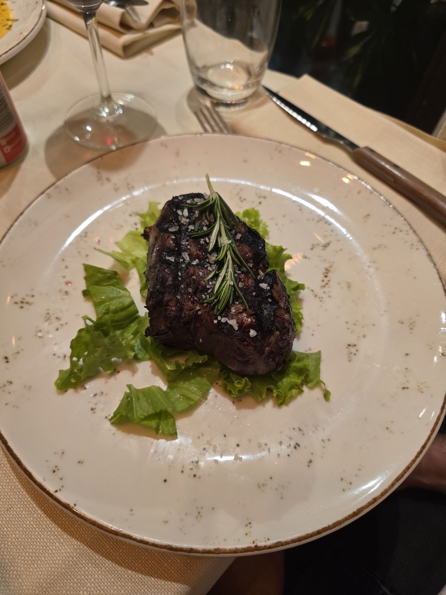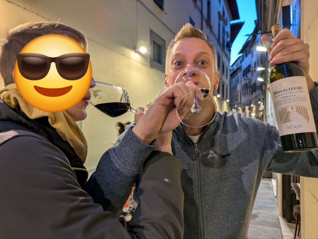 Das erwählte Restaurant schien sehr begehrt zu sein und so warteten wir in einer Schlange vor dem Eingang auf einen freien Tisch. Ansgar und Max nutzten die Zeit sinnvoll und genehmigten sich schon mal in der Warteschlange ein Glas des eigentlich für den Sonnenuntergang angedachten Weins. Diese Idee gefiel dem Kellner scheinbar so gut, dass er direkt noch Prosecco aufs Haus dazu reichte.