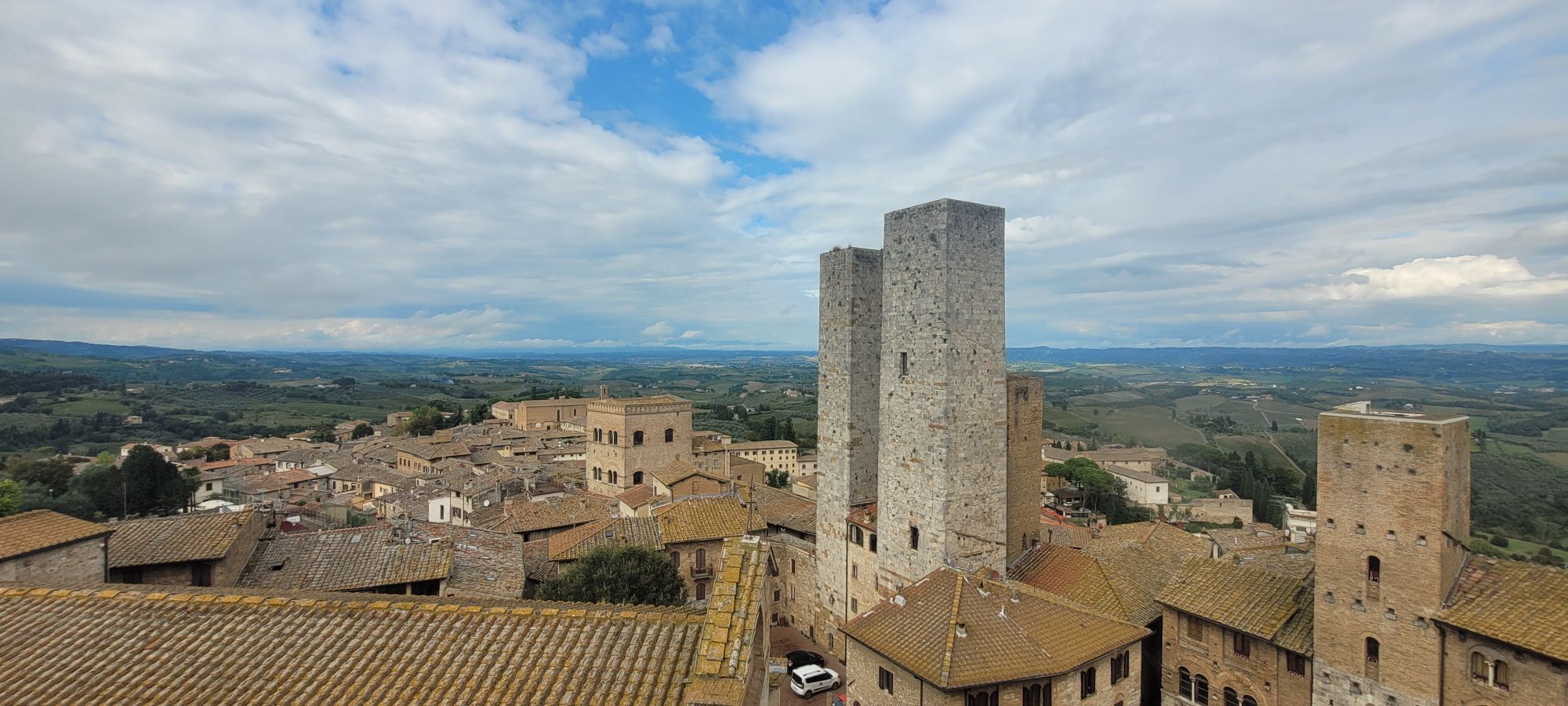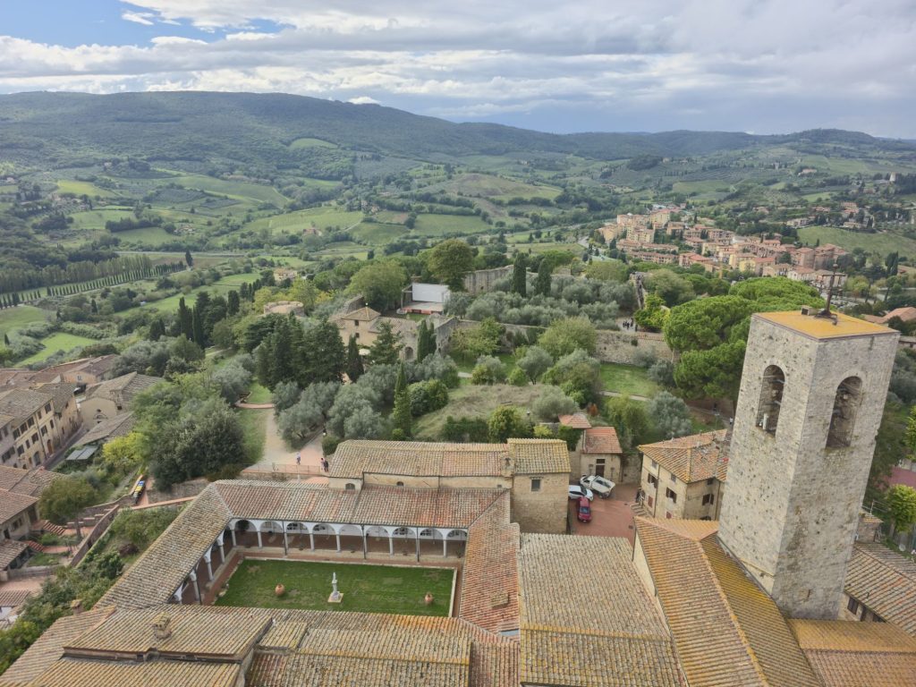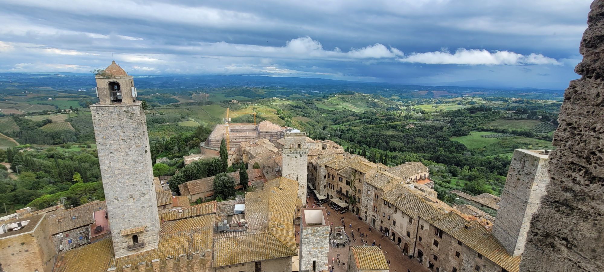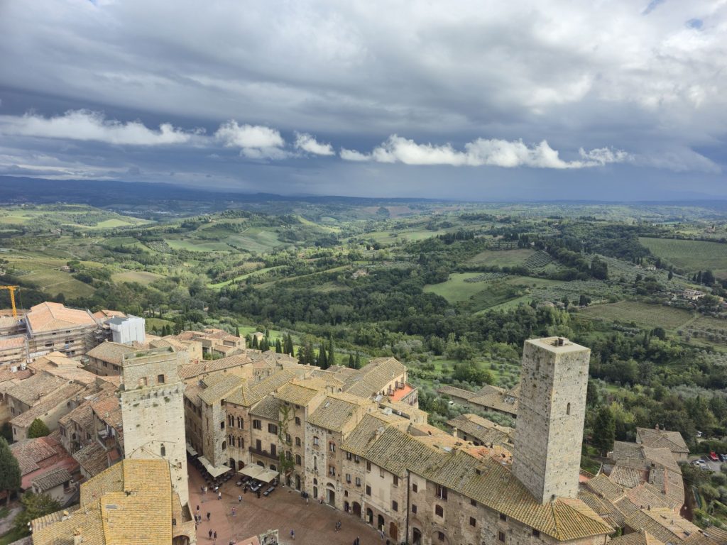 Weiter ging’s nach San Gimignano, wo wir uns den Torre Grossa vorgenommen haben. Der Turm ist mit stolzen 54 Metern der höchste der Stadt – und wurde schon 1311 fertiggestellt. Damals durfte kein anderer Turm höher gebaut werden, quasi ein mittelalterlicher „Skyline-Monopolvertrag“. Wer ihn erklimmt, steigt also nicht nur durch enge Durchstiege (bei denen selbst Hobbits den Kopf einziehen müssten), sondern wandert buchstäblich durch 700 Jahre Geschichte. Und was die vielen Türme betrifft: die entstanden damals vor allem aus Konkurrenzgehabe der reichen Familien. Jeder wollte zeigen, wer mehr Geld, Macht und Dickköpfigkeit hat – so wurde die Stadt irgendwann zur „mittelalterlichen Manhattan-Version“, nur eben mit deutlich mehr Eseln und weniger Yellow Taxis.