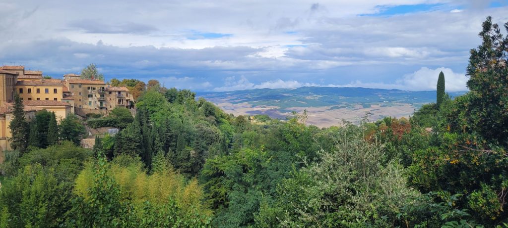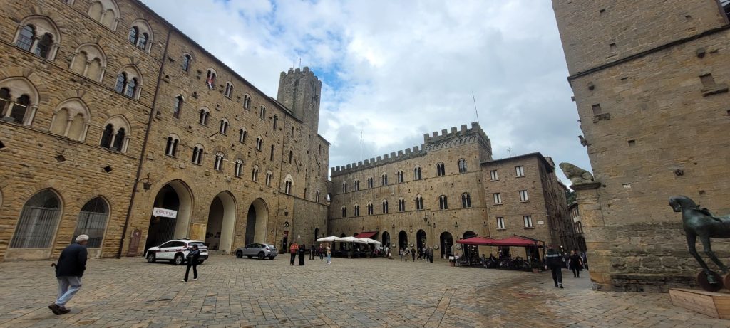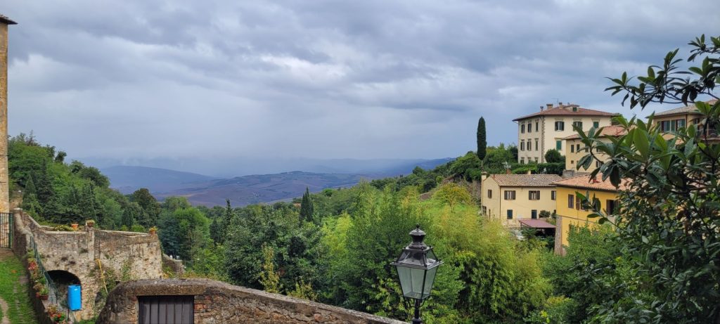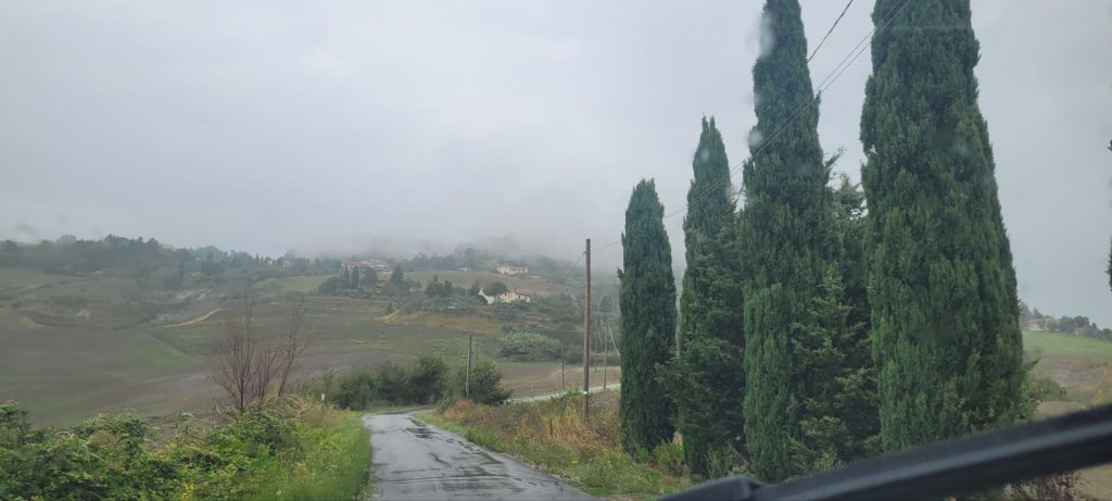 Tja, was sollen wir sagen… das kurzweilige Glück des guten Wetters sollte uns nicht lange beschert bleiben. So weckte uns heute morgen erneut das stetige Trommeln des Regens… beim Frühstück tranken wir uns mit Kaffee und Orangensaft Mut an, den Tag halbwegs optimistisch zu gestalten. So fuhren wir hoch, in Richtung Volterra, welches zu diesem Zeitpunkt in einer dicken, fetten Regenwolke steckte und aus dem Tal nur noch zu erahnen war.